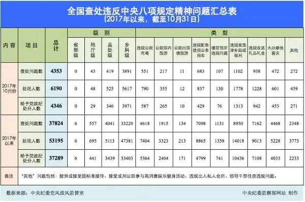 在“打虎”的前一天,中央纪委监察部网站发布2017年10月全国查处违反中央八项规定精神问题月报数据。这是中央纪委连续第49个月发布违反中央八项规定精神问题月报数据,也是十九大之后的首次月报。