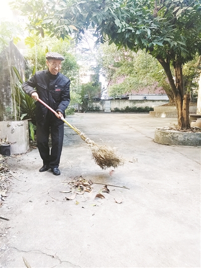 11年前,施克诚发现大院内有很多落叶,就拿起竹扫把扫起来,这一扫至今没有停止过。他一天早晚各扫一次,时间早上6点-6点半和傍晚时分。每天清晨,他打扫完卫生,6点半才去闽南师大操场操练40分钟4套太极拳。有时,落叶较多,劳动量大,他打扫到6点40分,就减少运动量,打30分钟3套太极拳。“每天早起劳动,还能锻炼身体,一举两得呀。”施克诚老人说。